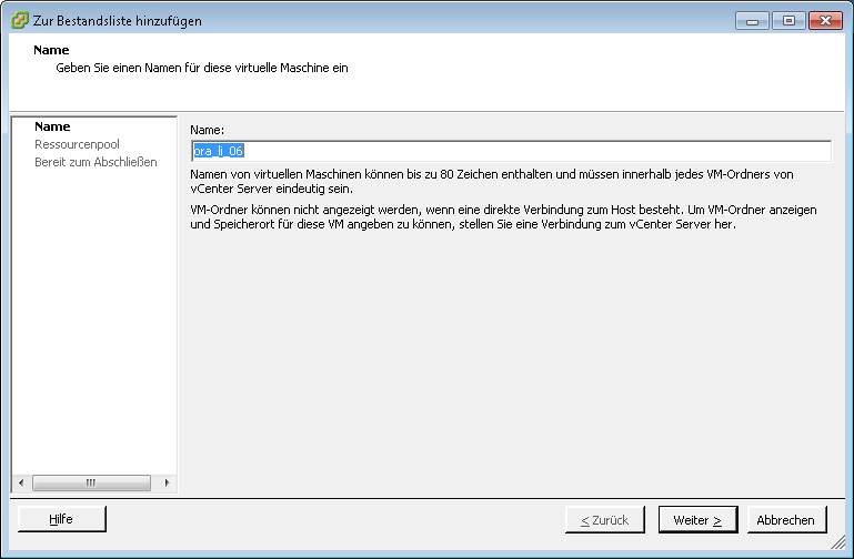1) Festlegen von den Name der neuen virtullen Maschine